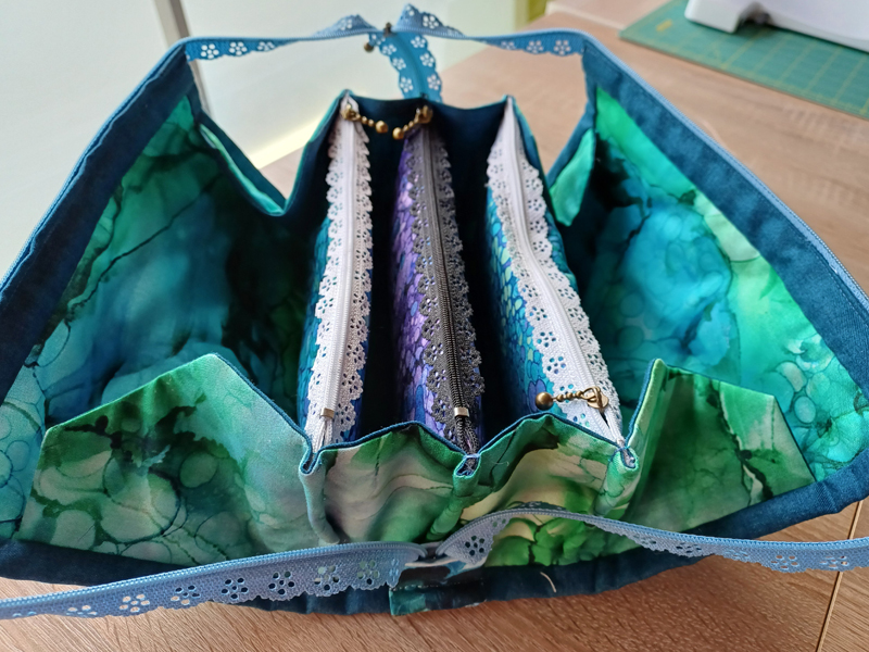 Ich hatte ziemlich Respekt davor, einen Reißverschluss einzunähen. Mit guter Erklärung von Karin und einem richtigen Füßchen war das gar kein Problem. Trotzdem ging es knifflig weiter. Die Innentäschchen sollten richtig eingenäht und der Reißverschluss auf der richtigen Seite befestigt werden. Aber …. wir haben ja keine „Trennungsängste“.